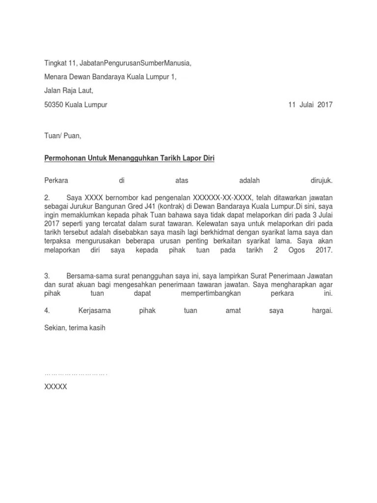 Ini format dan contoh anda boleh guna untuk minta tangguh lapor masuk bekerja di tempat baru contoh surat . Pegawai berkenaan akan melapor diri di tempat ;